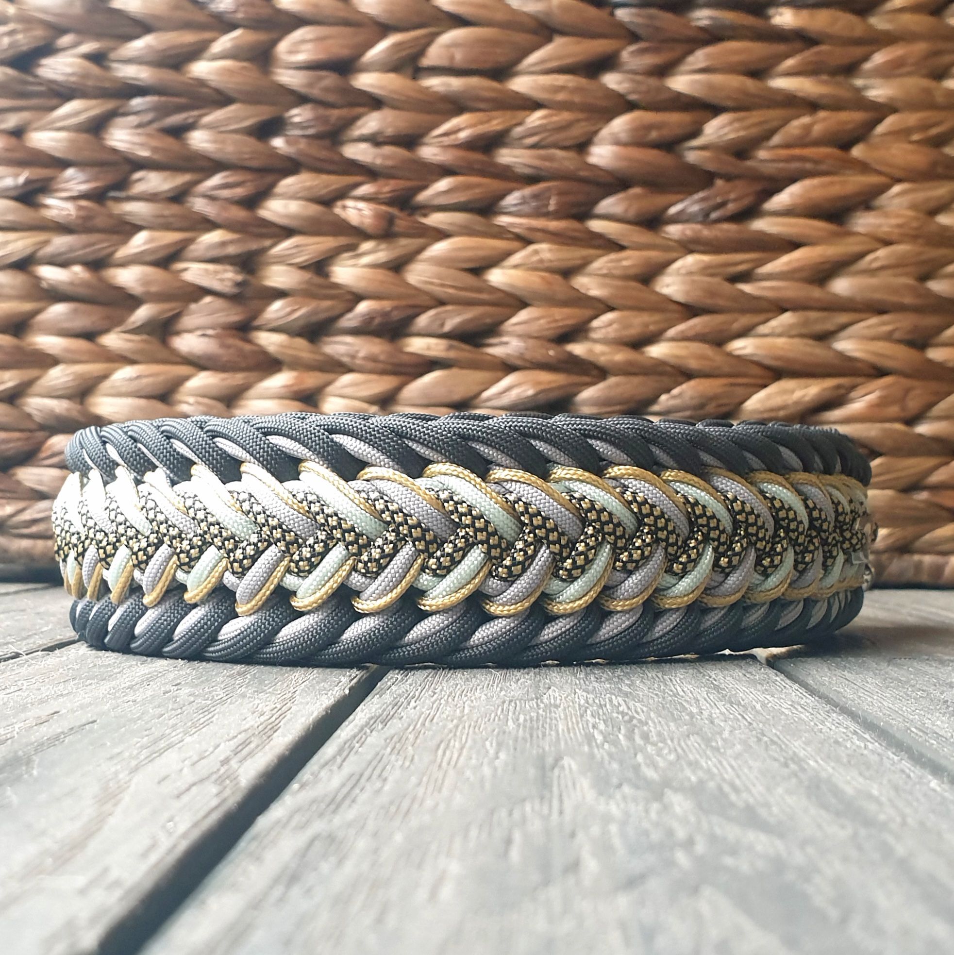 Die Angabe der Halsbandbreite basiert auf der Verwendung von Paracord Typ 3 mit einem Cord-Durchmesser von ca. 3,8 mm. Sollte ein Knoten gefallen, ist er aber zu breit? Geben Sie mir gern Bescheid, ich kann das Halsband auch mit Paracord Typ 1 knoten, welches die Breite um ca. 50% reduziert.